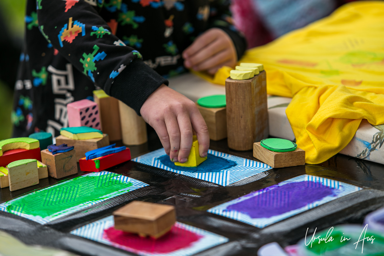 Botanical artist Ge Warburton and visual artist Hilary Peterson joined forces to facilitate a fabric-stamping booth. For a small fee, participants could colour their own fabrics, or buy a piece of clothing or a blank tea-towel to stamp with ready-cut patterns. Both women have run immensely popular workshops at Panboola in the past, so I was keen to see how this one would fare. (Spoiler alert: It was busy all day!)