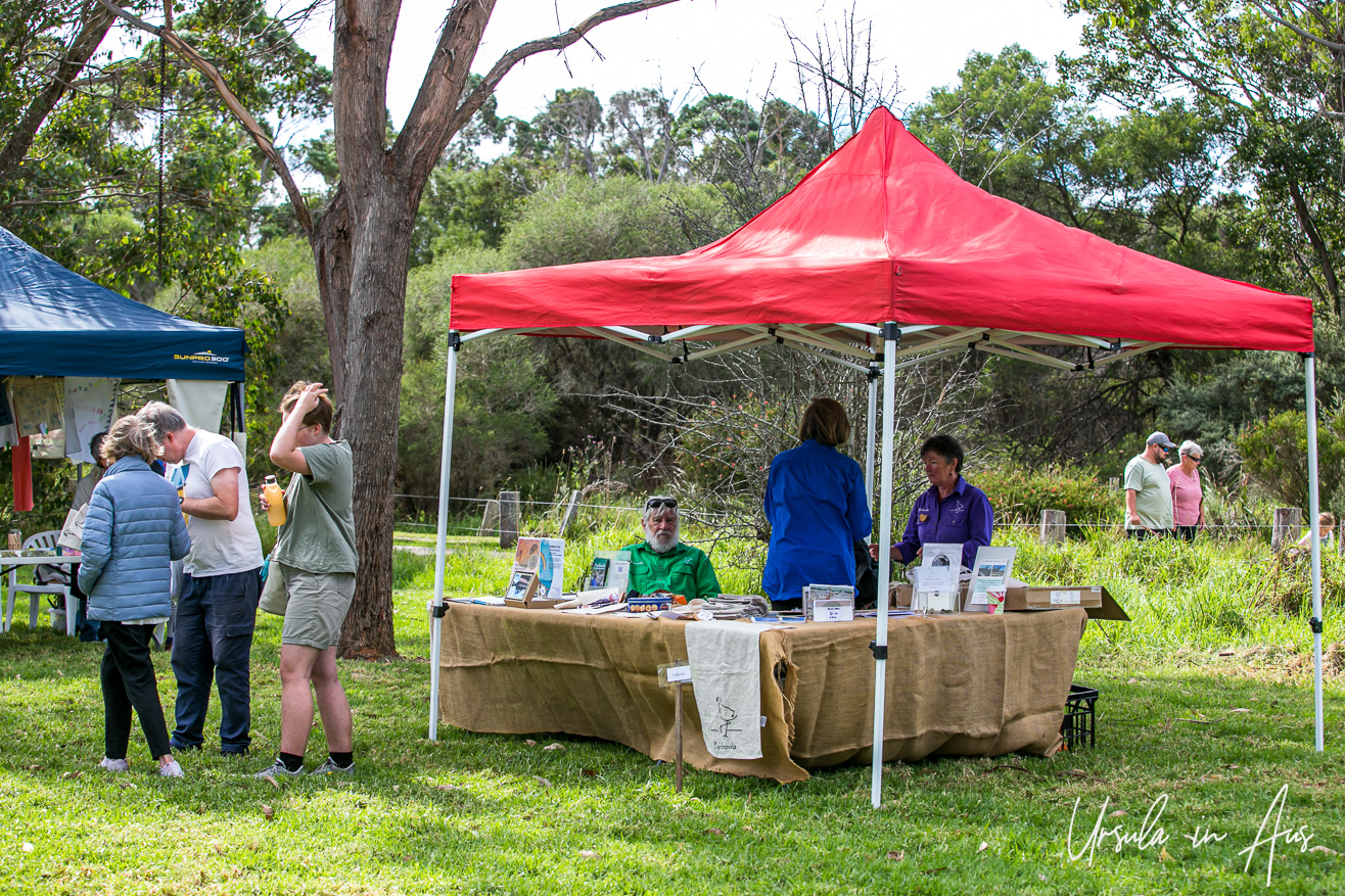 These are the linchpins: Wetlands Project Coordinator Michelle Richmond chats with volunteers selling products and dispensing information at the Panboola Stand.