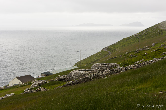 Stone walls still divide the countryside as we descend to the road and round the hill towards Dunquin.