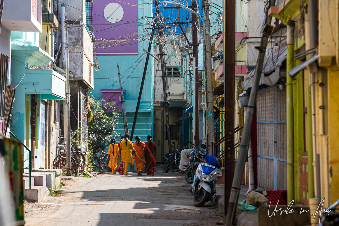 Women in saris walking down the street away from the Tiruchirappalli Rock Fort Temple, India