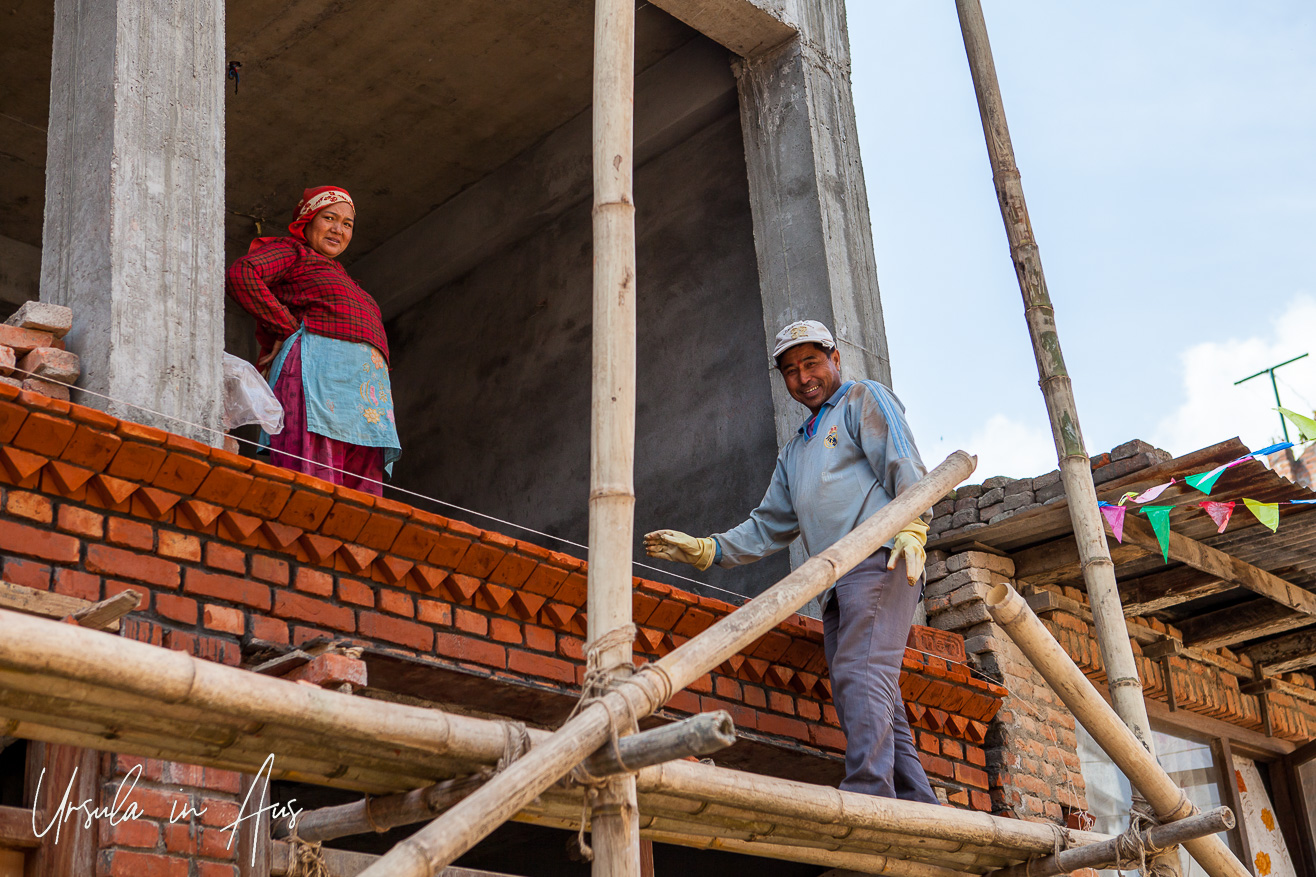 A husband and wife have their hands full rebuilding the wreckage of their home in Bungamati, Nepal, almost two years after the devastating earthquake in April, 2015.