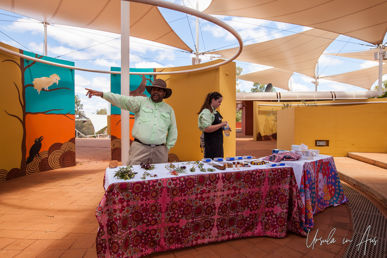In the amphitheatre area outside the Arkani Theatre, local food-plants are laid out ahead of the daily Indigenous Bush Food Experience.