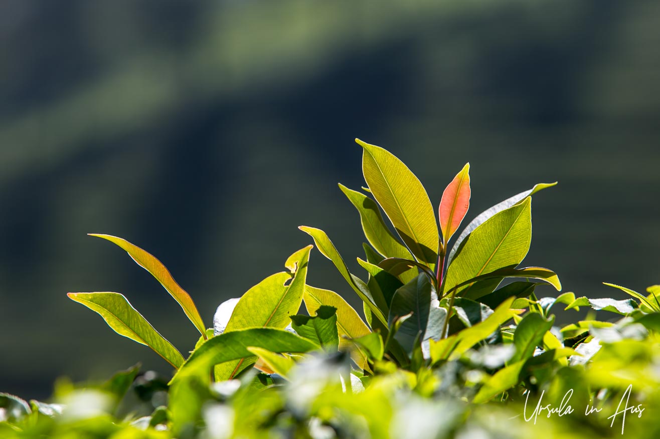 I’m not a tea drinker. As this is India, I could not get a decent cup of coffee in the breakfast room. I could – at least – look over the patterns made by the tidy evergreen tea plants (Camellia sinensis) below. Against the hill, silver oak trees (Grevillea robusta), native to Australia, provide shelter from strong winds and shade from the sun.