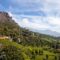 Up the road, rocky bluffs rise above the tea.