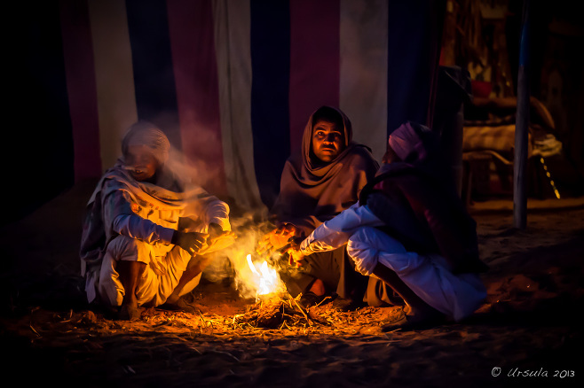The people who bring their animals or other trade-goods to the Pushkar Fair grounds sleep on site: in tents or under their carts. When I arrived on my second morning there, it was cold, and still dark. Those people who were up were huddled around their camp fires.