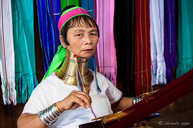 The Kayan Lahwi women work mostly in cotton and synthetic fibres, weaving brilliant pattern, making the traditional scarves and tunics.