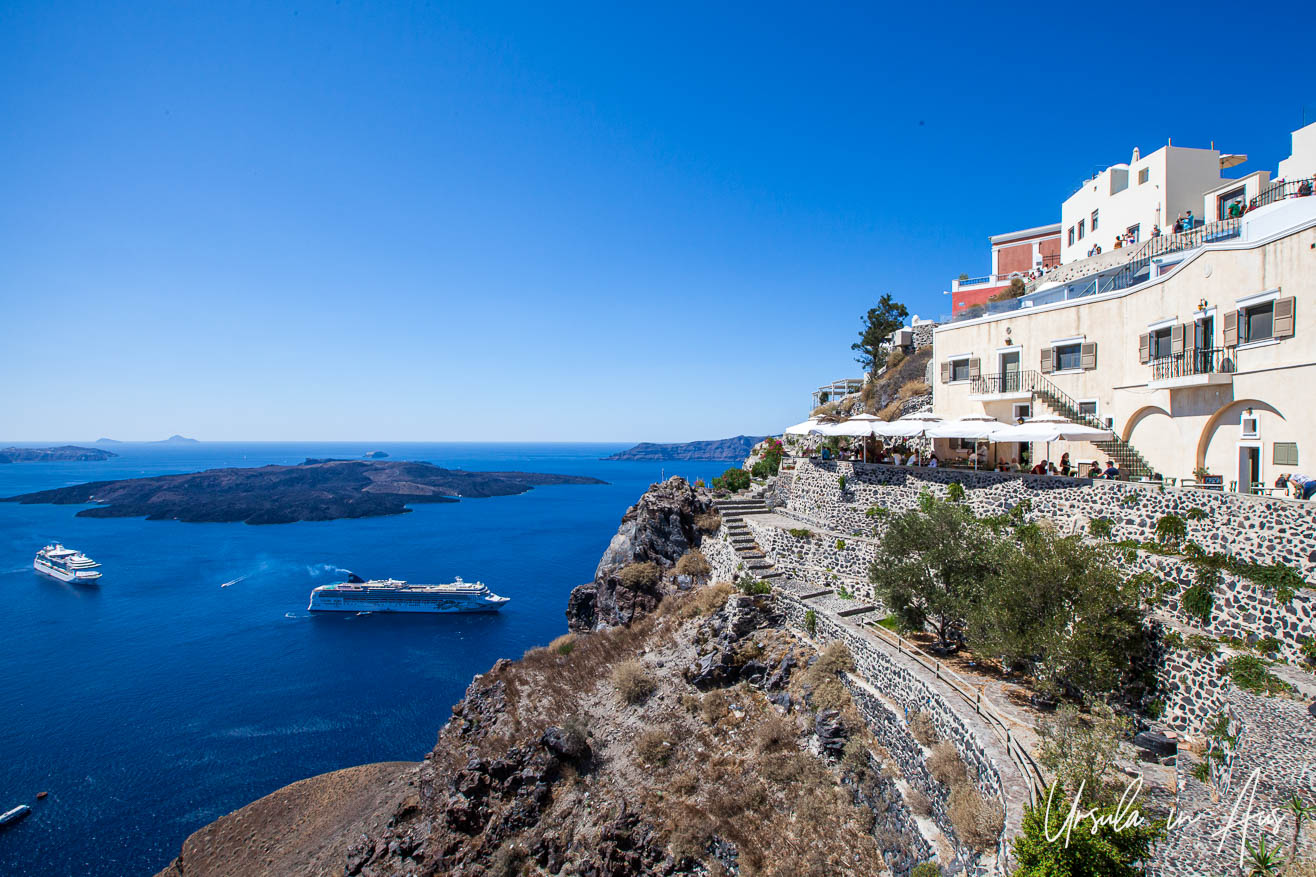 Santorini’s official and historic name is Thira; this is where the capital town of Fira gets its name. It is only a 20-minute drive from the ferry terminal, but most of that is zig-zagging up the pumice cliffs that make up the 400 metres (1,312 feet) high caldera on the island’s western edge.
