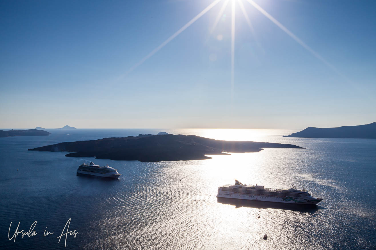 The sun drops over the still-busy waters of the Aegean Sea as my first day in Santorini draws to a close.