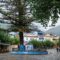 Rooftops rise all around against a backdrop of mountain and low-hanging cloud.