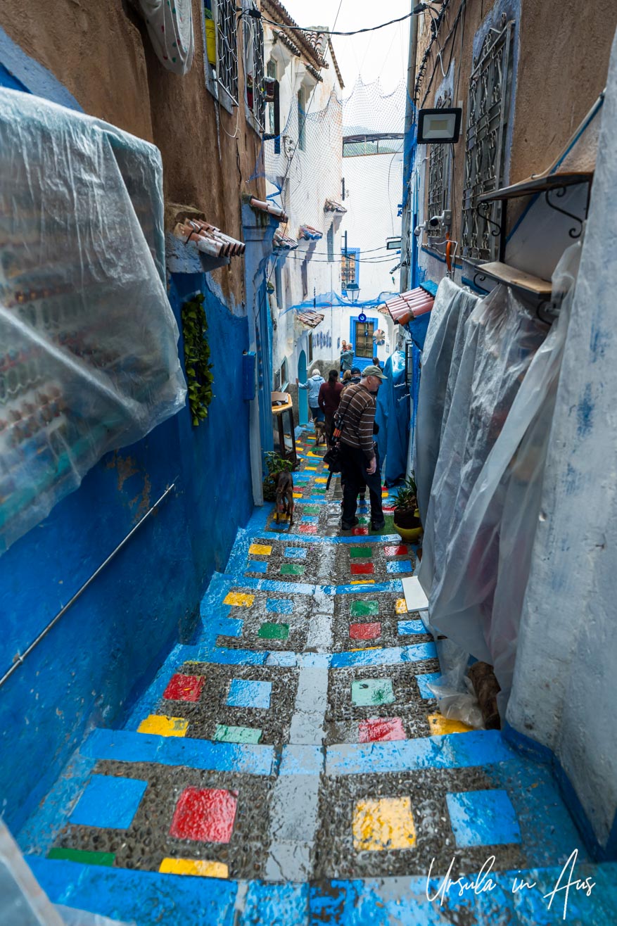 Autumn rain washes the narrow, winding streets in the medina – the old city – of Chefchaouen: a blue-washed delight in Morocco’s northwestern Rif Mountains.