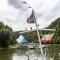 Flying the company flag, the city flag of Stadt Kelheim, and the blue and white Bavarian state flag, a tourist boat cruises up the scenic Danube Gorge.