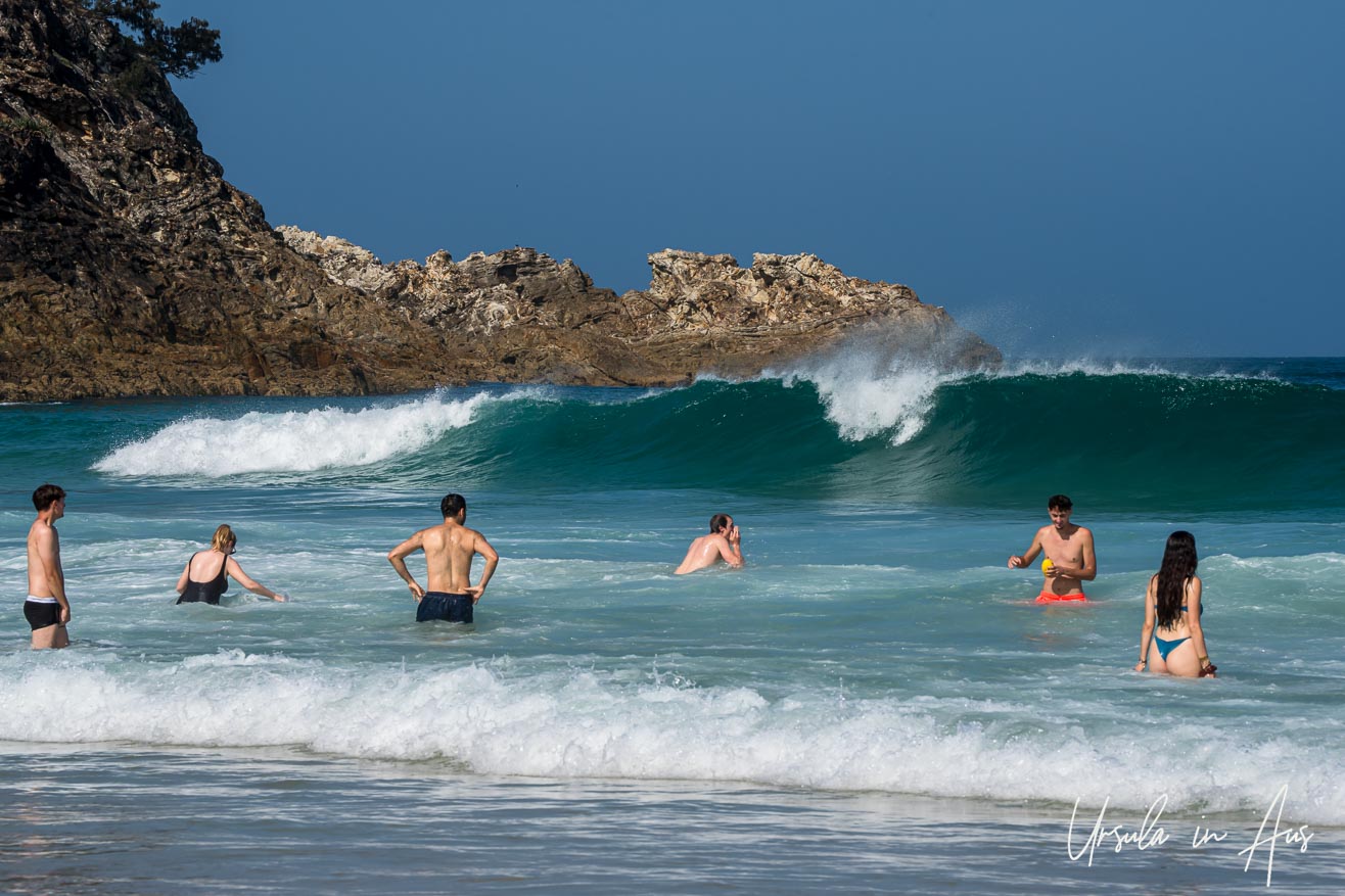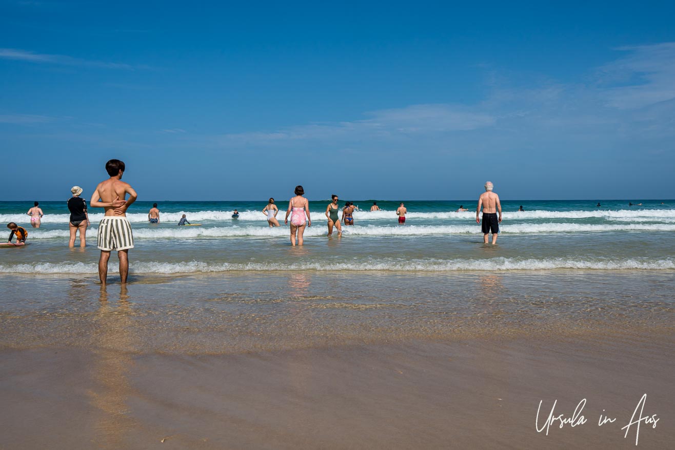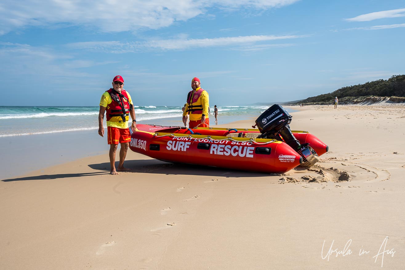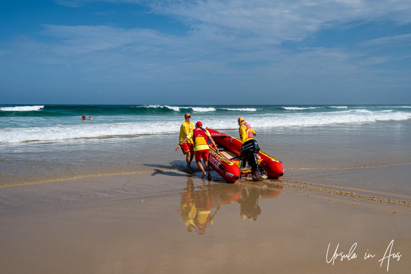 Main Beach is patrolled, making it safer for swimmers. The volunteer surf lifesavers, in their distinctive red and yellow uniforms, are happy to pose for the camera.