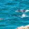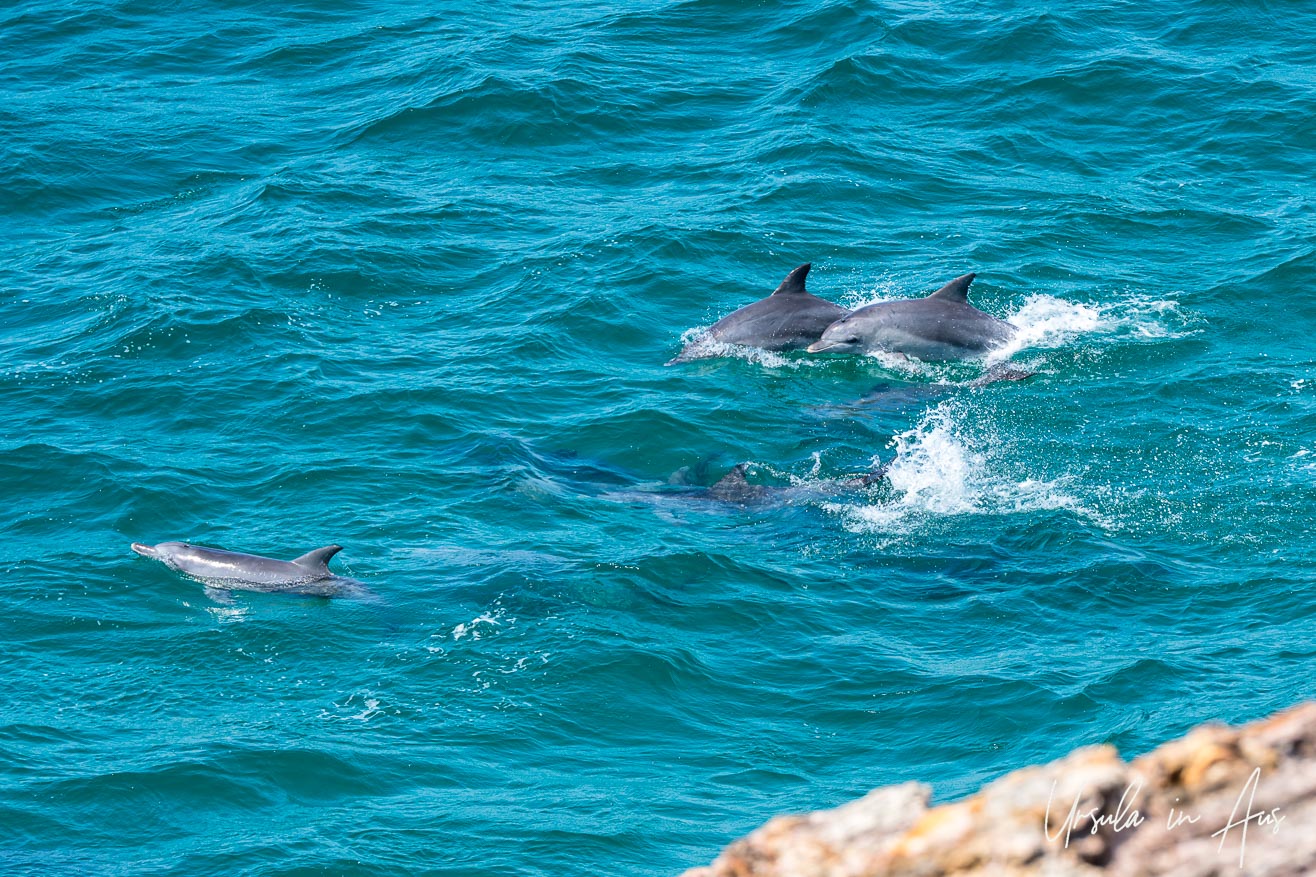 A small pod of dolphins – probably Indo-Pacific bottlenose dolphins (Tursiops aduncus) race through the waters below.