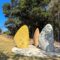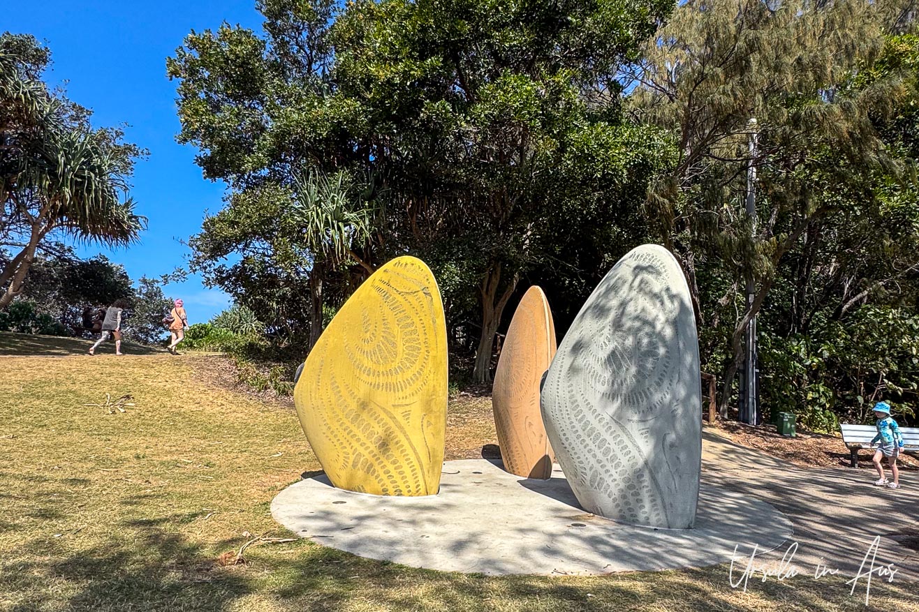 Eugaries (or ugari) are edible saltwater clams (Donax deltoides), commonly called pipis in Australia. Delvene Cockatoo-Collins, the artist who installed these beautiful place-markers in the park at the other end of the Gorge Walk writes: