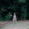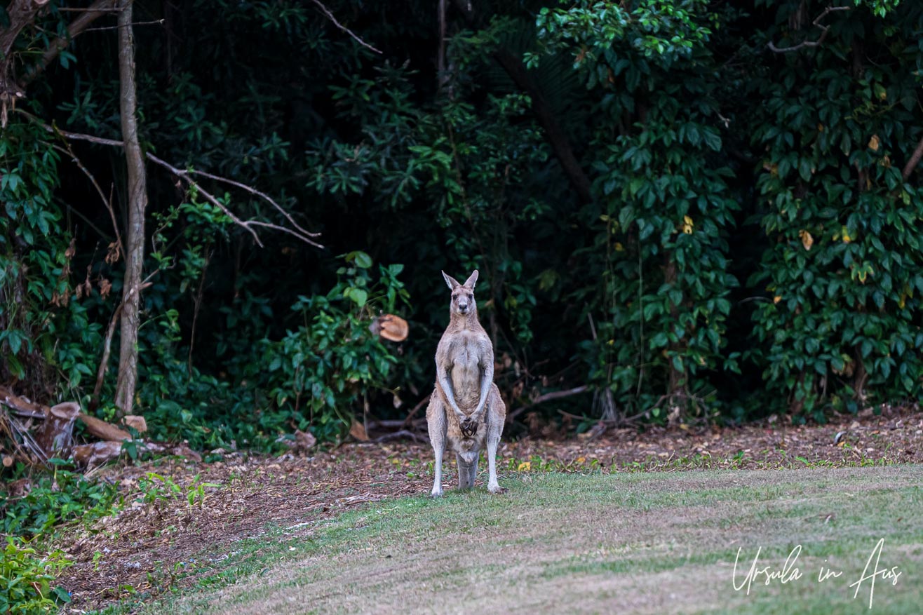 A large eastern grey kangaroo (Macropus giganteus) stands at the side of the road through town, just watching us.