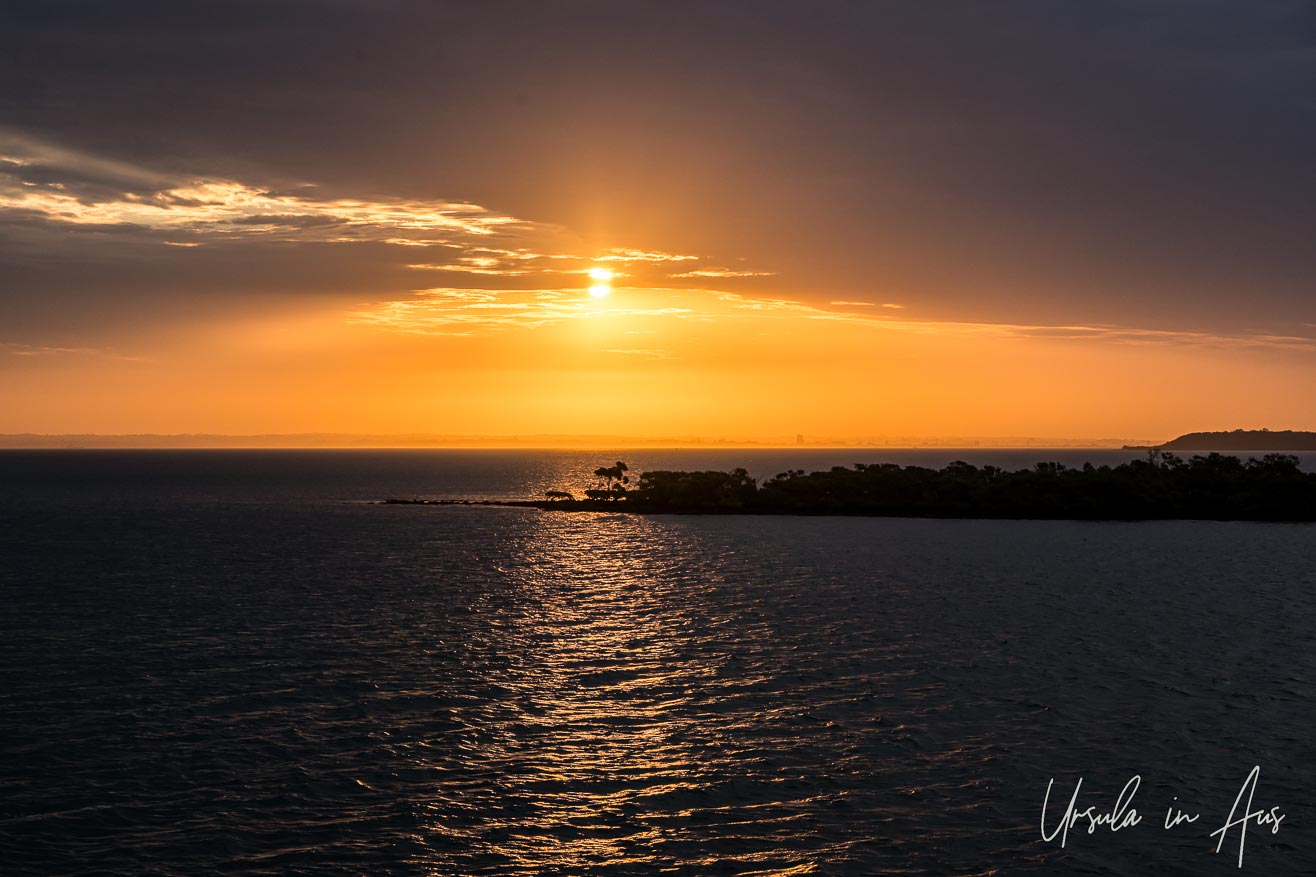 While we are on the ferry back to the mainland, the sun sets over the mangrove trees in Moreton Bay.