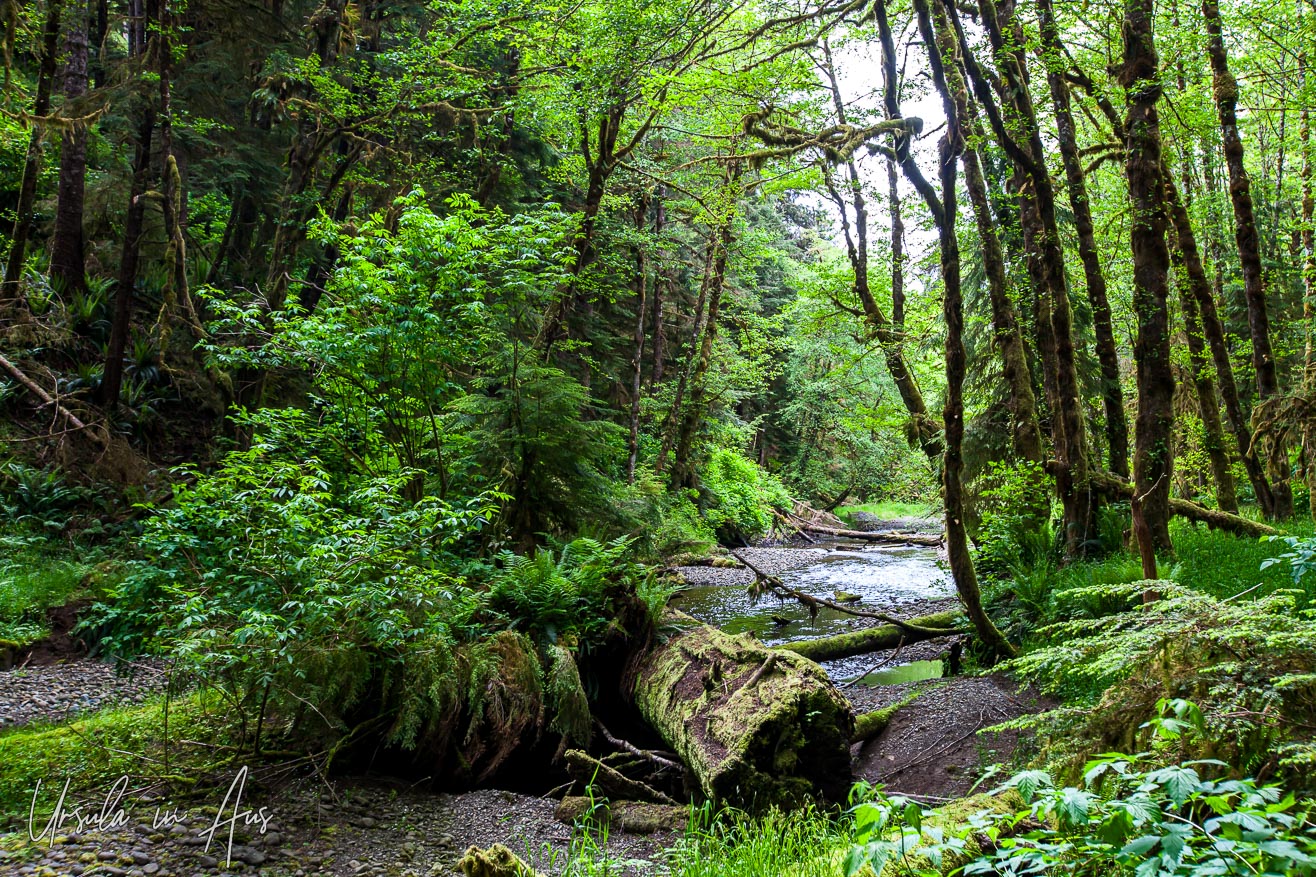 Sometimes called the Haans Creek Loop, part of the trail meanders along the creek. In the right season, salmon spawn in these waters.