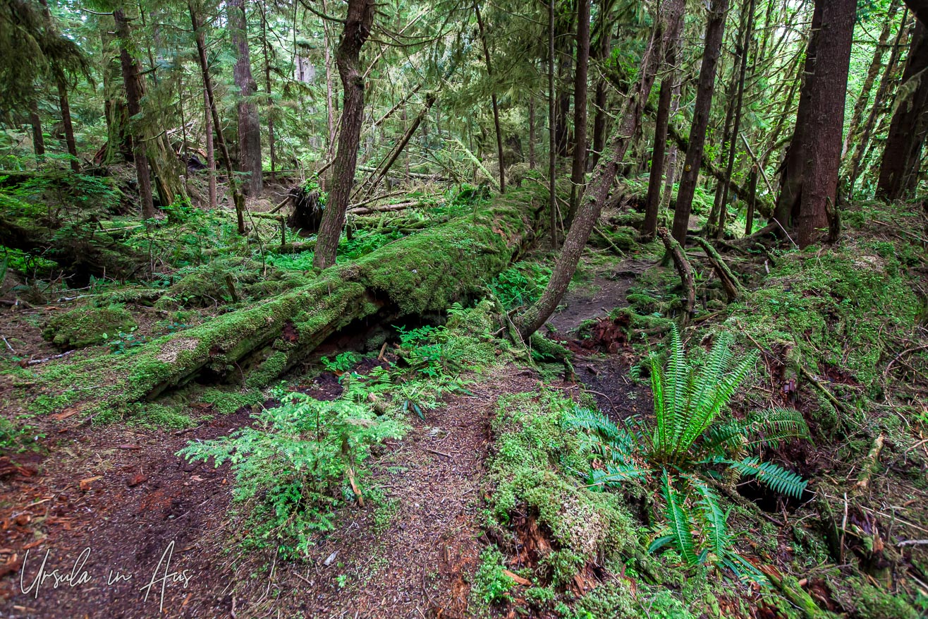 Mossy trees and logs, Dover Loop trail, Moresby Island, Haida Gwaii BC Canada
