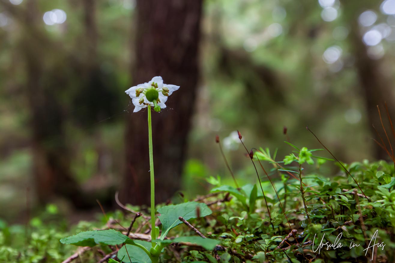 A single pyrola on the forest floor, Dover Loop trail, Moresby Island, Haida Gwaii BC Canada