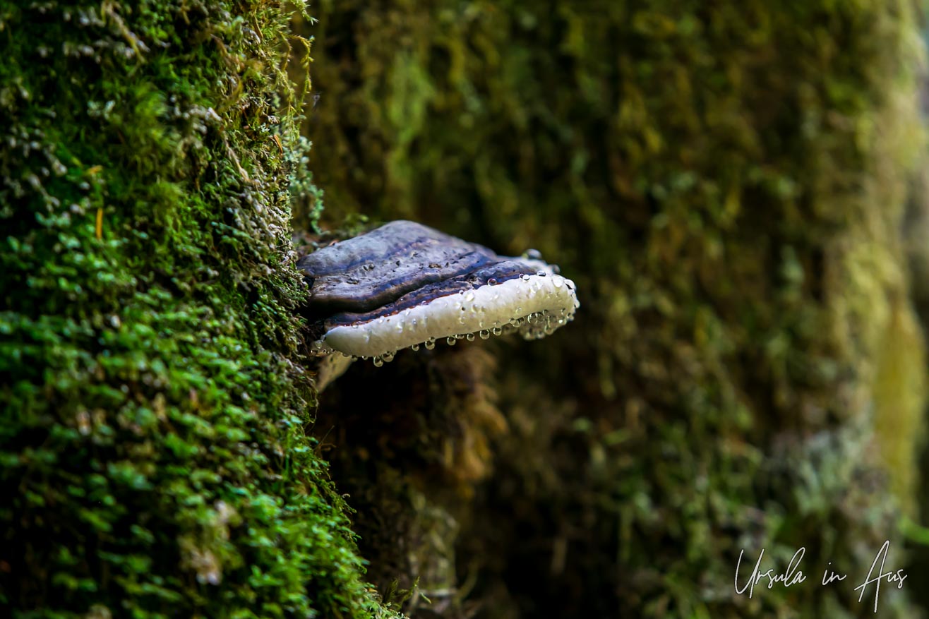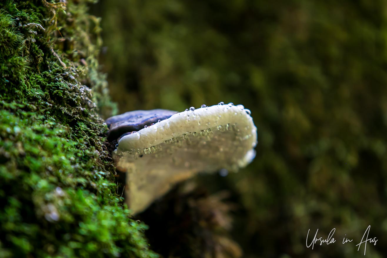 Moisture droplets on a bracket fungus, Dover Loop trail, Moresby Island, Haida Gwaii BC Canada