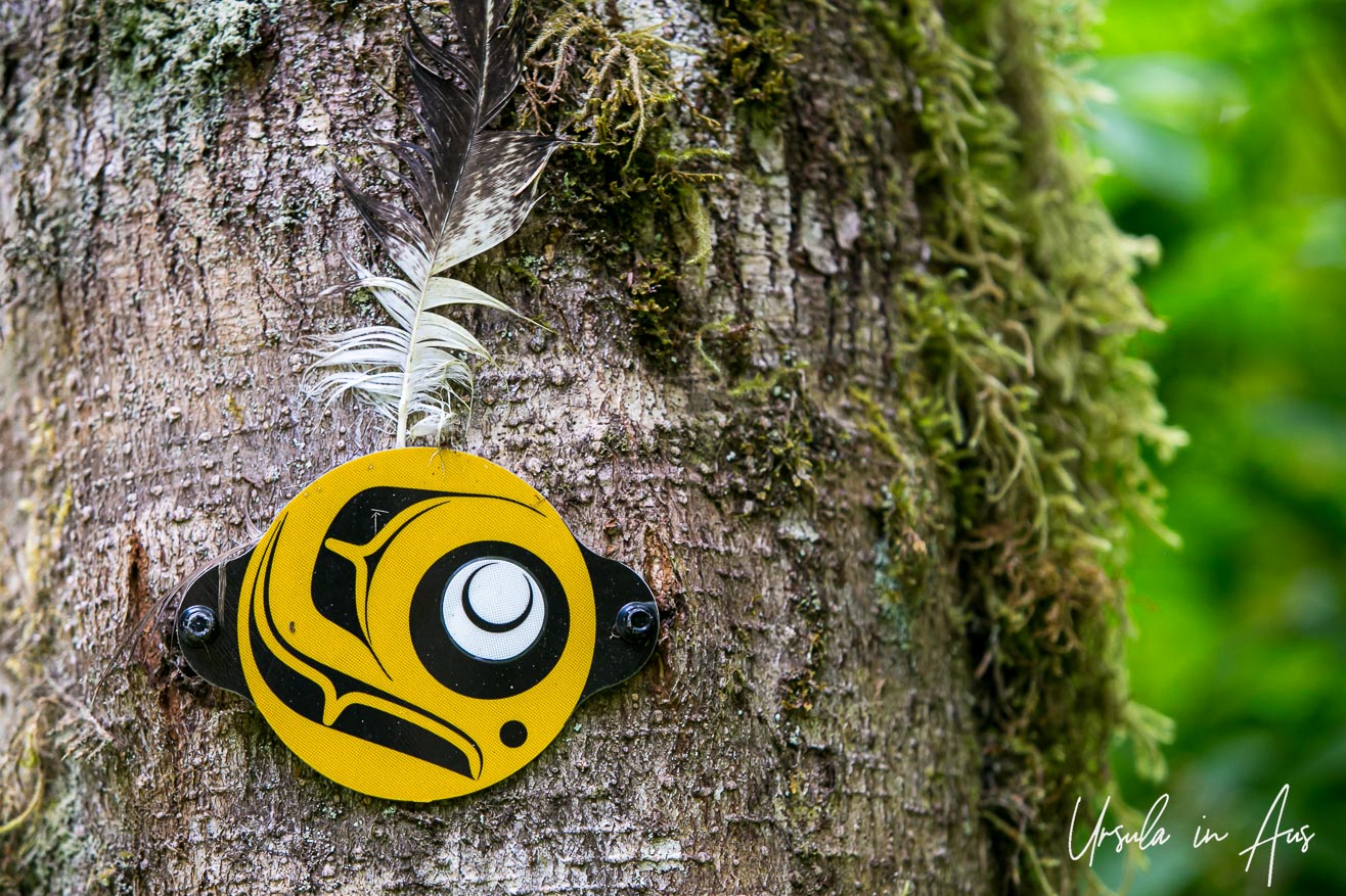 Yellow and black Haida trail marker, Dover Loop trail, Moresby Island, Haida Gwaii BC Canada