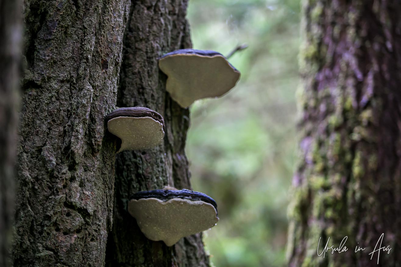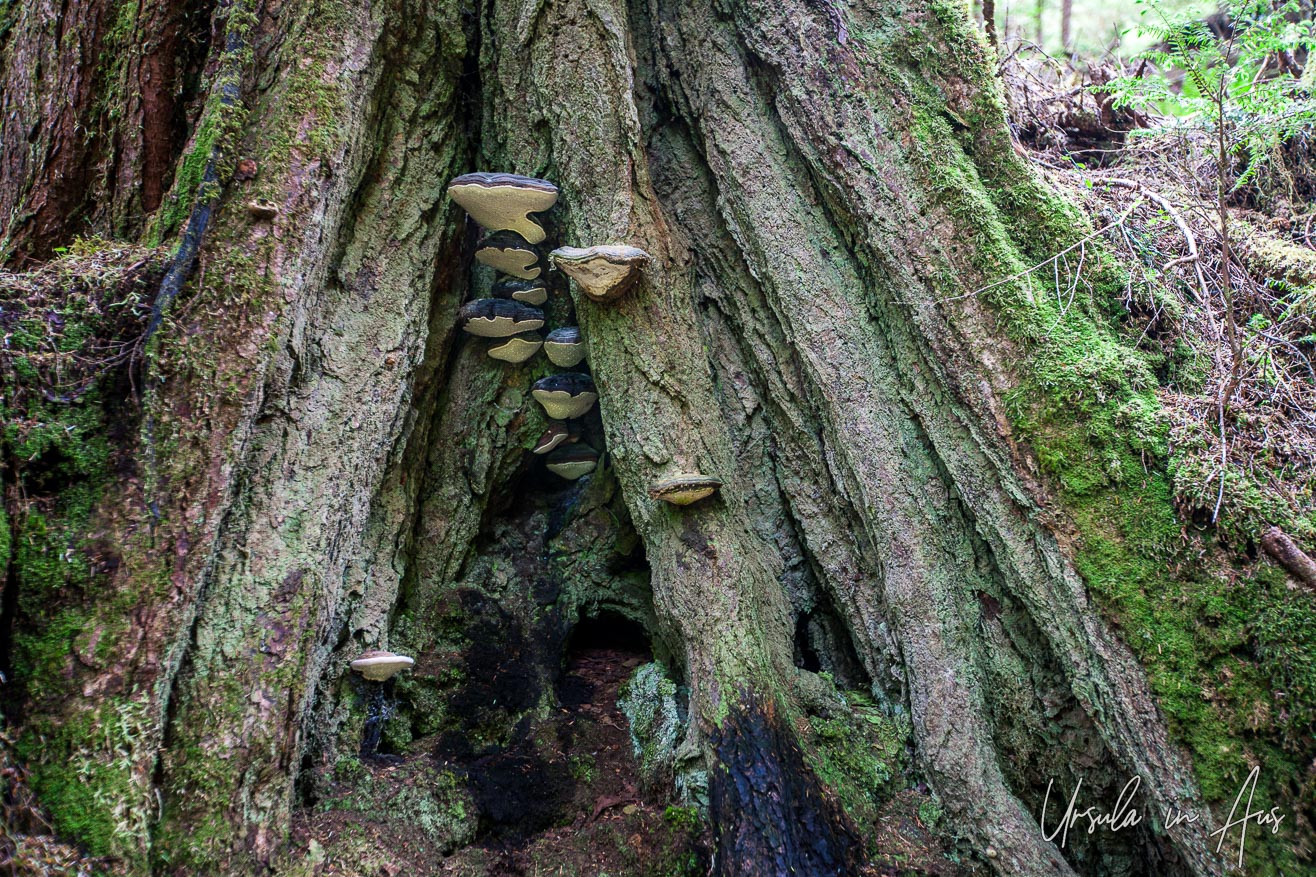 Bracket fungi on a tree trunk, Dover Loop trail, Moresby Island, Haida Gwaii BC Canada