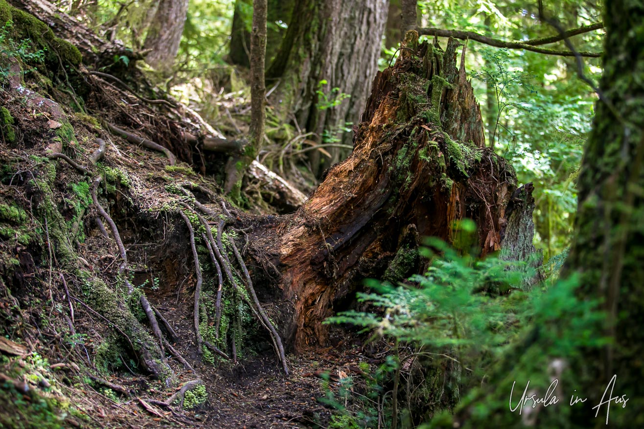 The cycle of life continues, with mosses, ferns, and saplings rising out of rotting stumps and leaf litter.