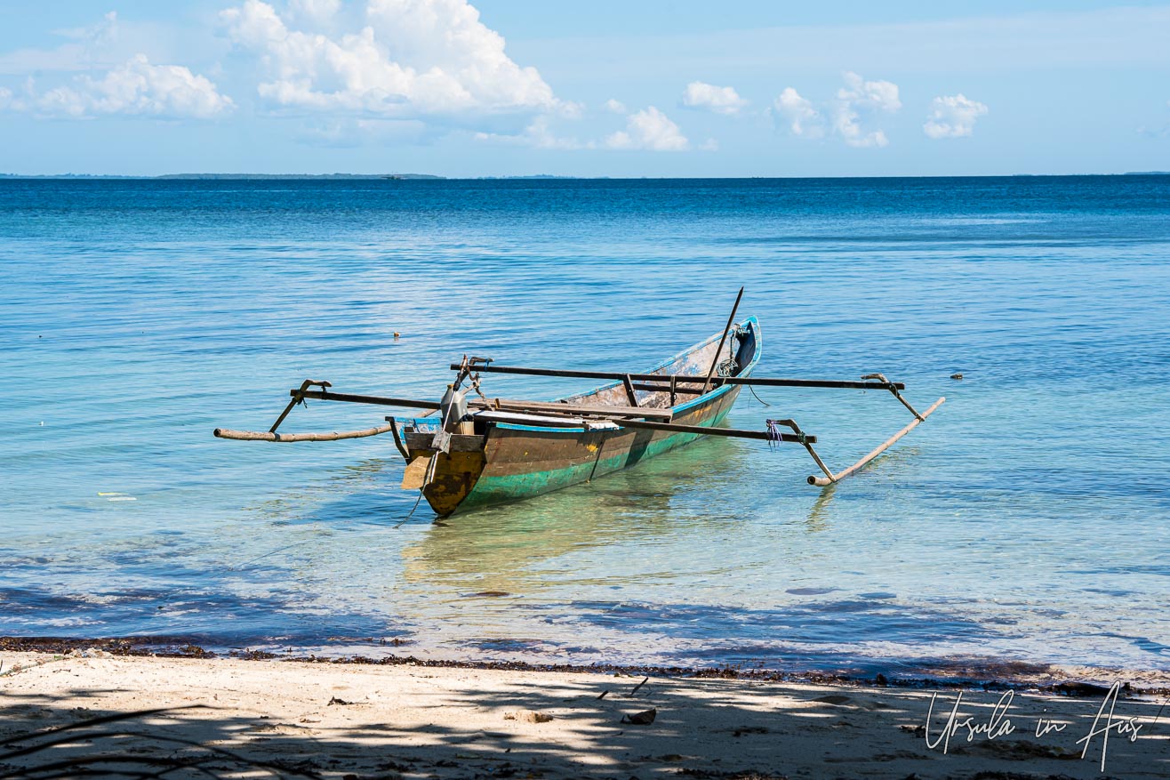Seen all across Indonesia, this type of small wooden outrigger boat is known as a jukung, cadik, or kano.