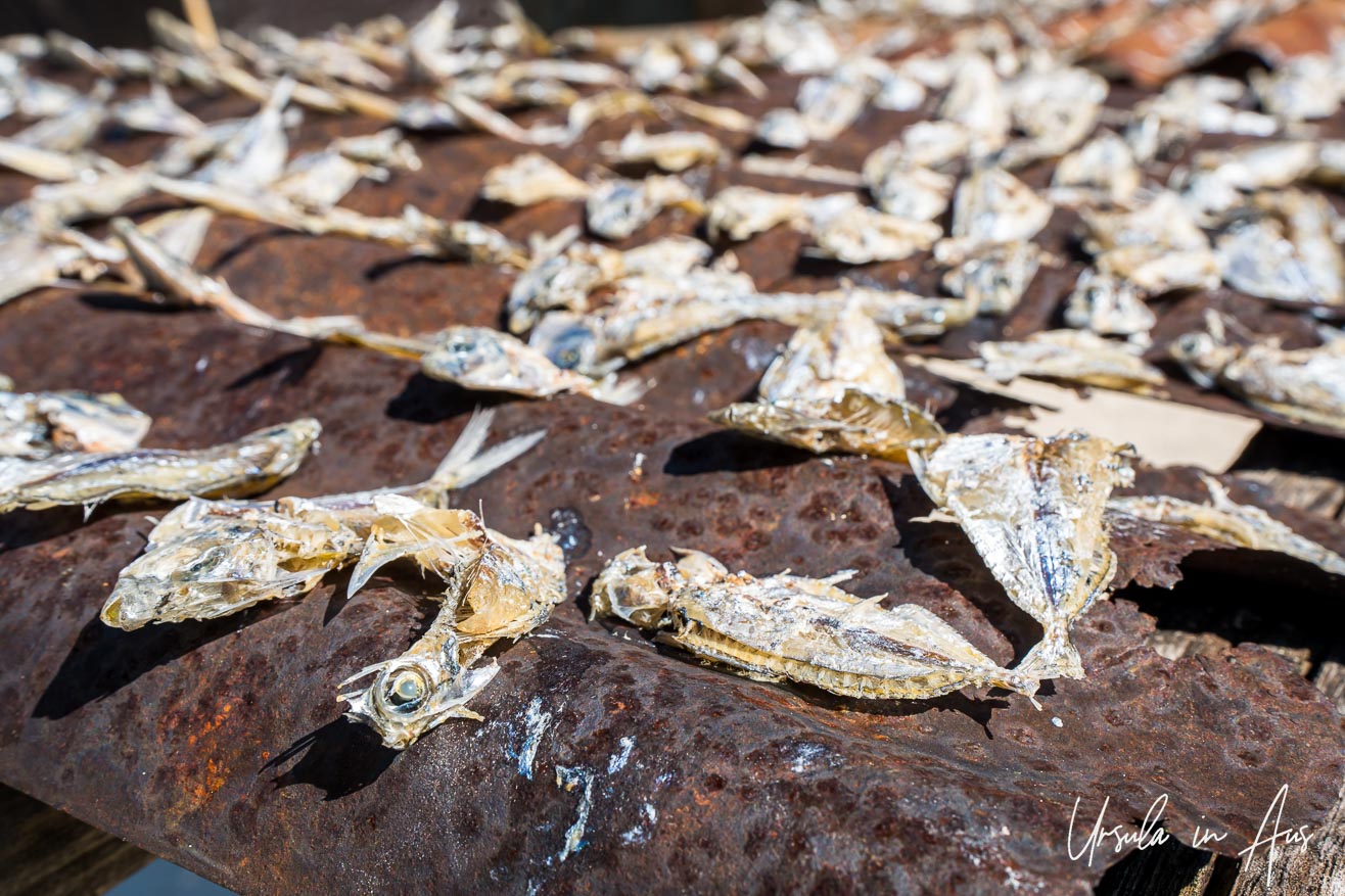 Food here is in the sea and in the trees. As I wander past the coconut trees, I find fish on corrugated iron sheeting, drying in the sun.