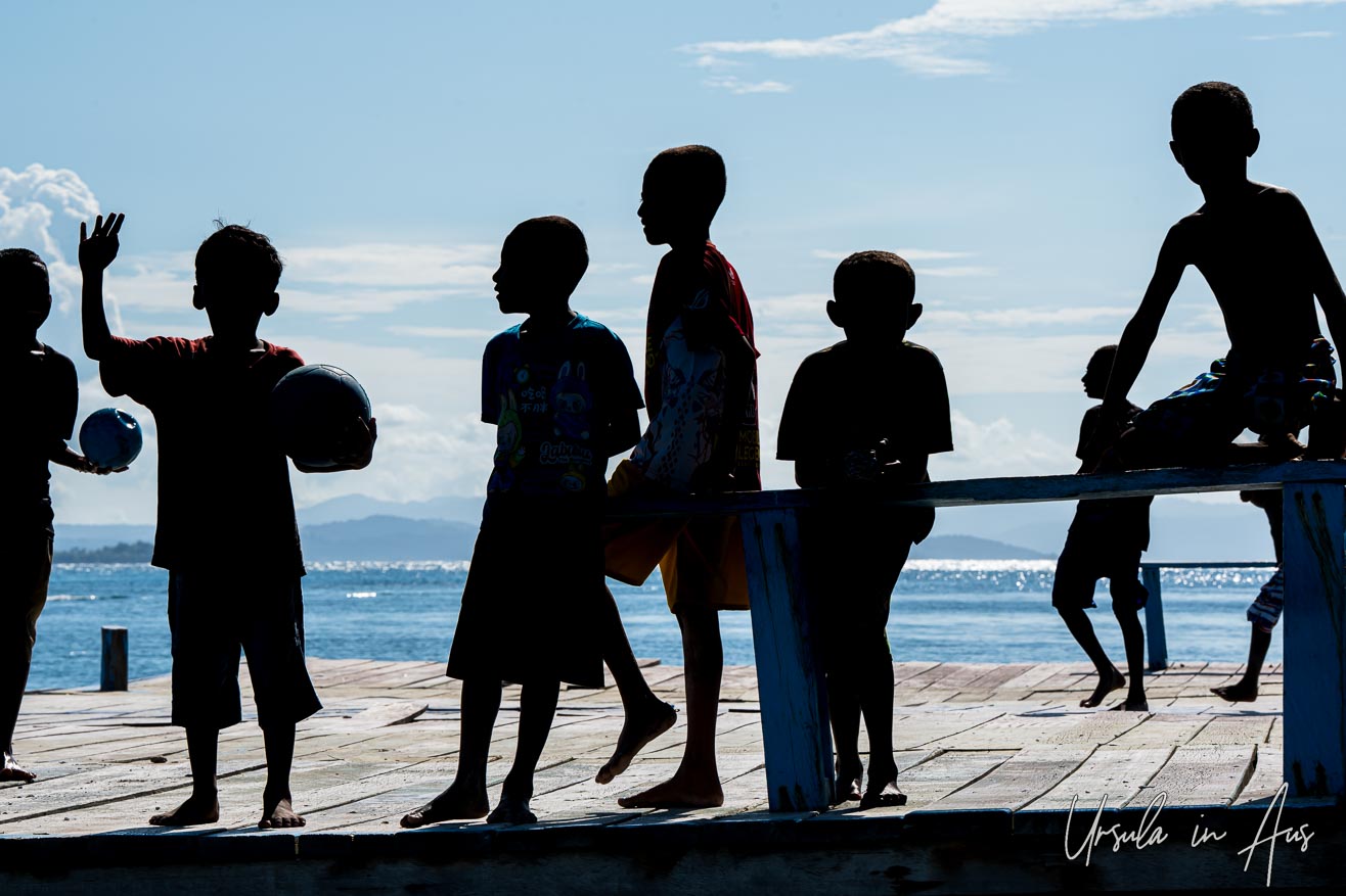 The older children rush to the jetty to wave us off as our tender leaves the island.
