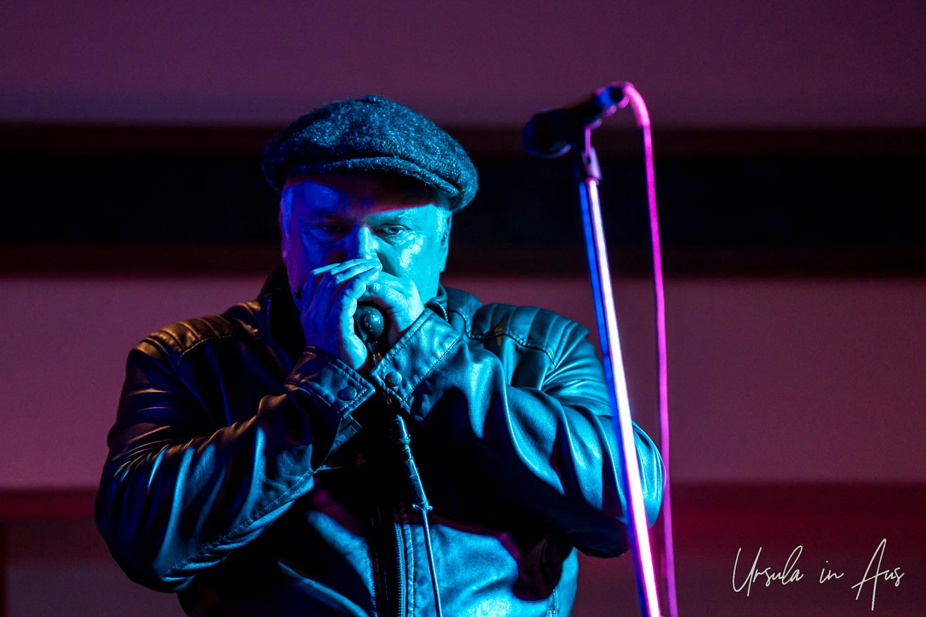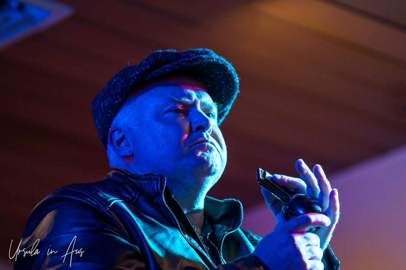 It seems fitting that a blue spotlight shines on award-winning Australian blues-and-roots singer and harmonica player, Dan Sullivan, as he joins the band Brothers on stage at the Thredbo Blues Festival in the Australian mountains.