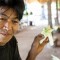 A typical burmese woman: thanaka powder on her face, flowers in her hair, and a big smile for the visitor.