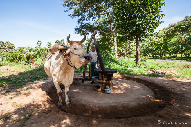 Just outside, in a spot of dappled shade, an older man supervises a bovine-operated millstone.
