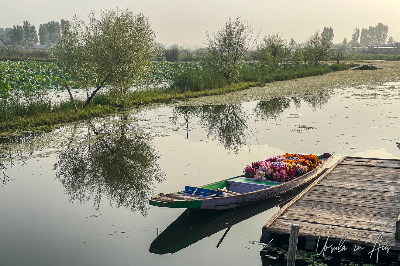 Early in the morning, one of Dal Lake’s distinctive wooden boats is waiting at our wharf, loaded with locally-grown flowers for sale. (iPhone12Pro)