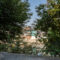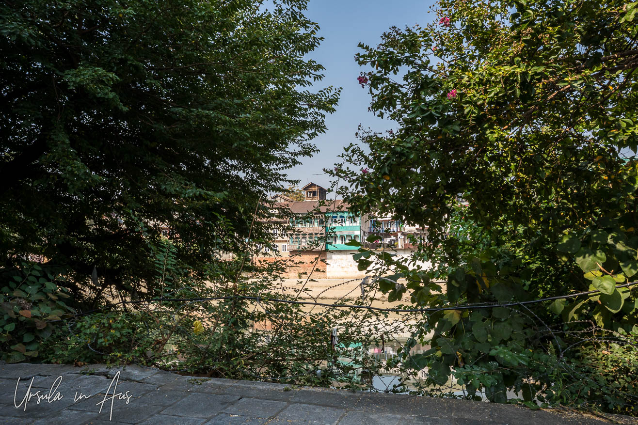 The mosque backs onto the main river through Srinagar; through the trees, we can just see the multi-story buildings on the other bank.