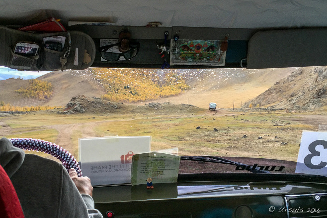 After breakfast, we set off for the volcano. Our guide G, wearing his traditional Mongol deel, races back to meet our UAZ. The ‘road’ is more like a series of wandering tracks that meander across the hillside and head nowhere in particular. (iPhone6)