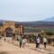 Modern tourists walk along the 1st century Roman road through the ruins of Volubilis in Morocco.