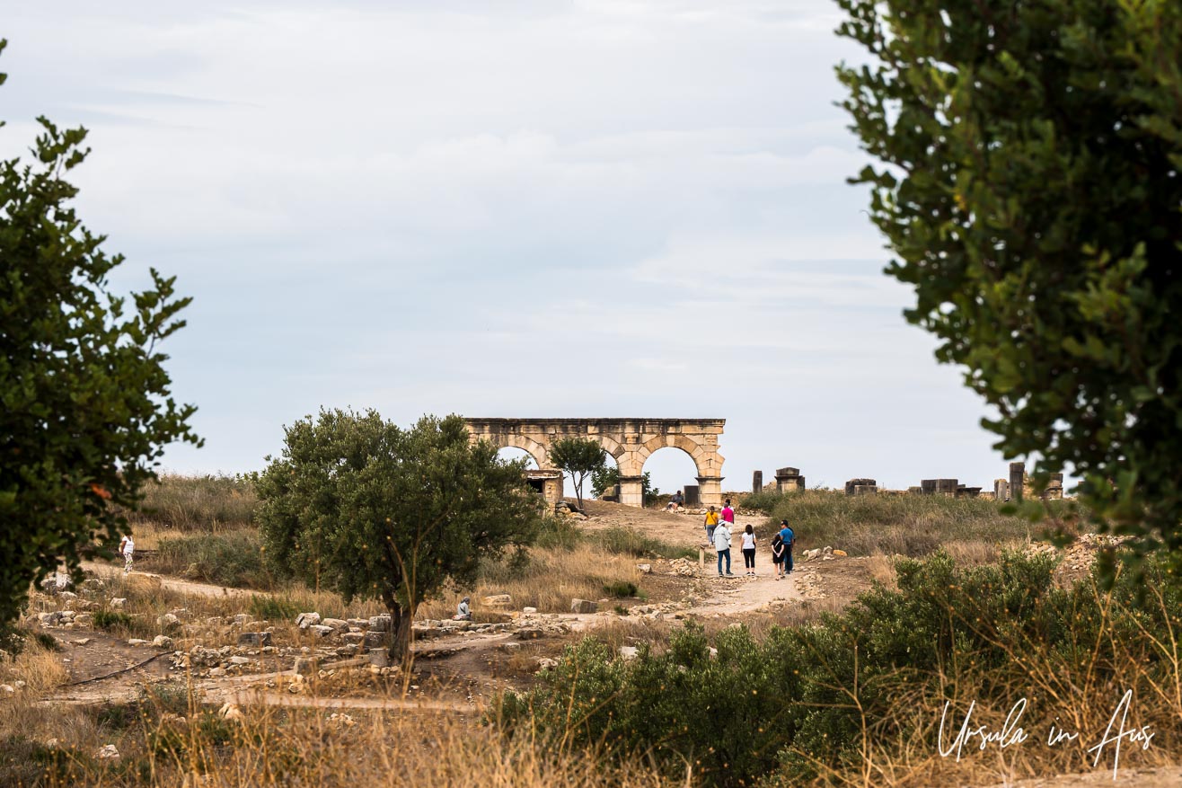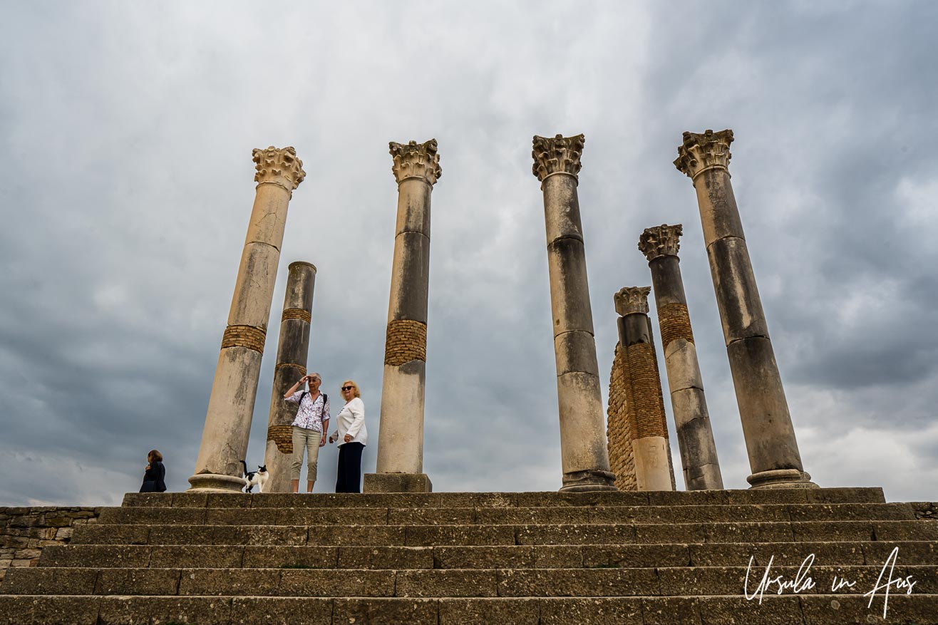 Modern tourists walk along the 1st century Roman road through the ruins of Volubilis in Morocco.