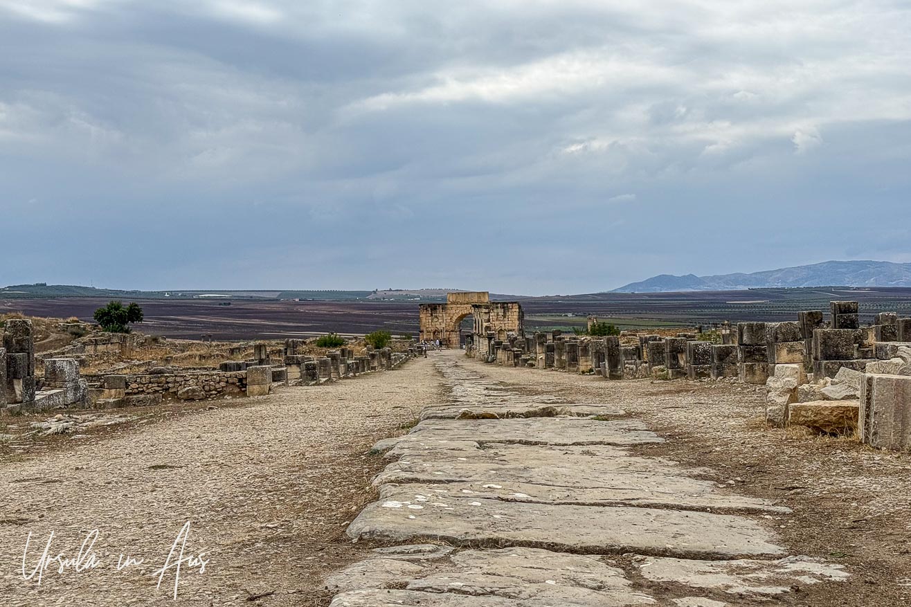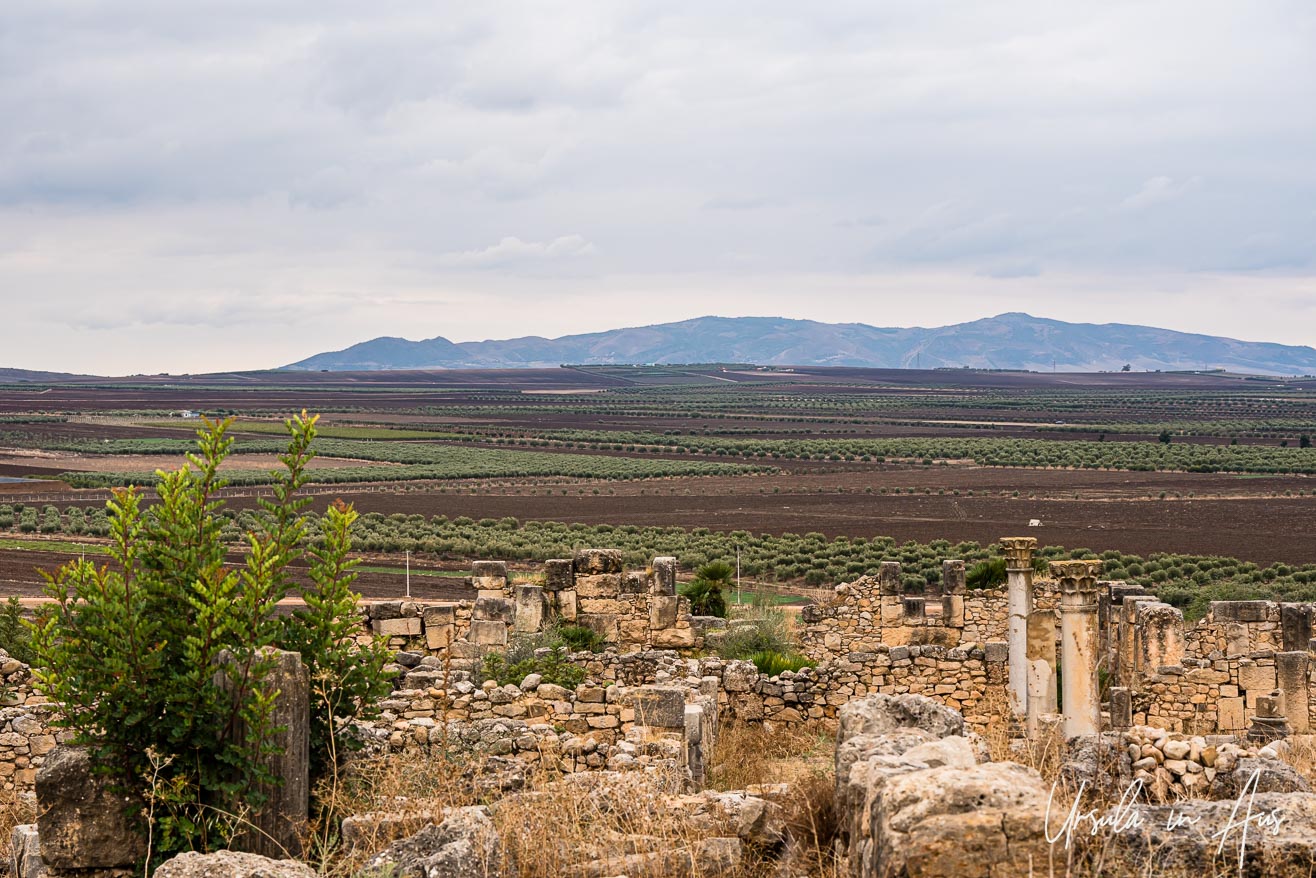 Outside the old boundary of the site, patterned fields stretch across the richly fertile plane to Mount Zerhoun on the horizon.