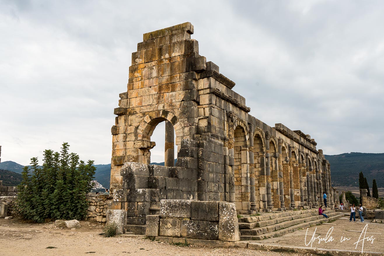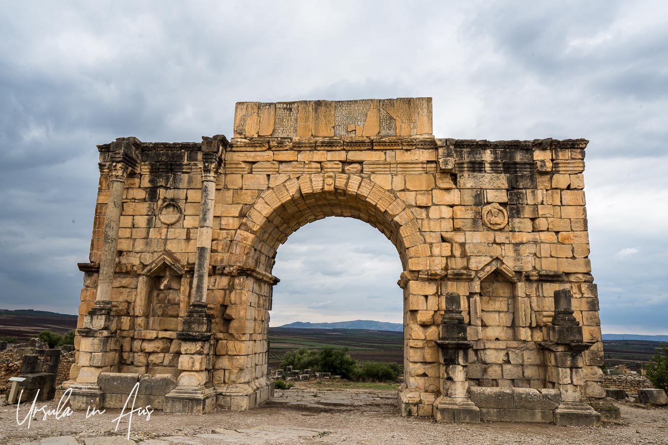 The Triumphal Arch of Volubilis was built in marble in 217 CE as tribute to Emperor Caracalla and his mother. Largely destroyed by an 18th-century earthquake, it was restored some time in the early 1930s. The inscription at the top was reconstructed from the fragments of stone found in the viscinity.