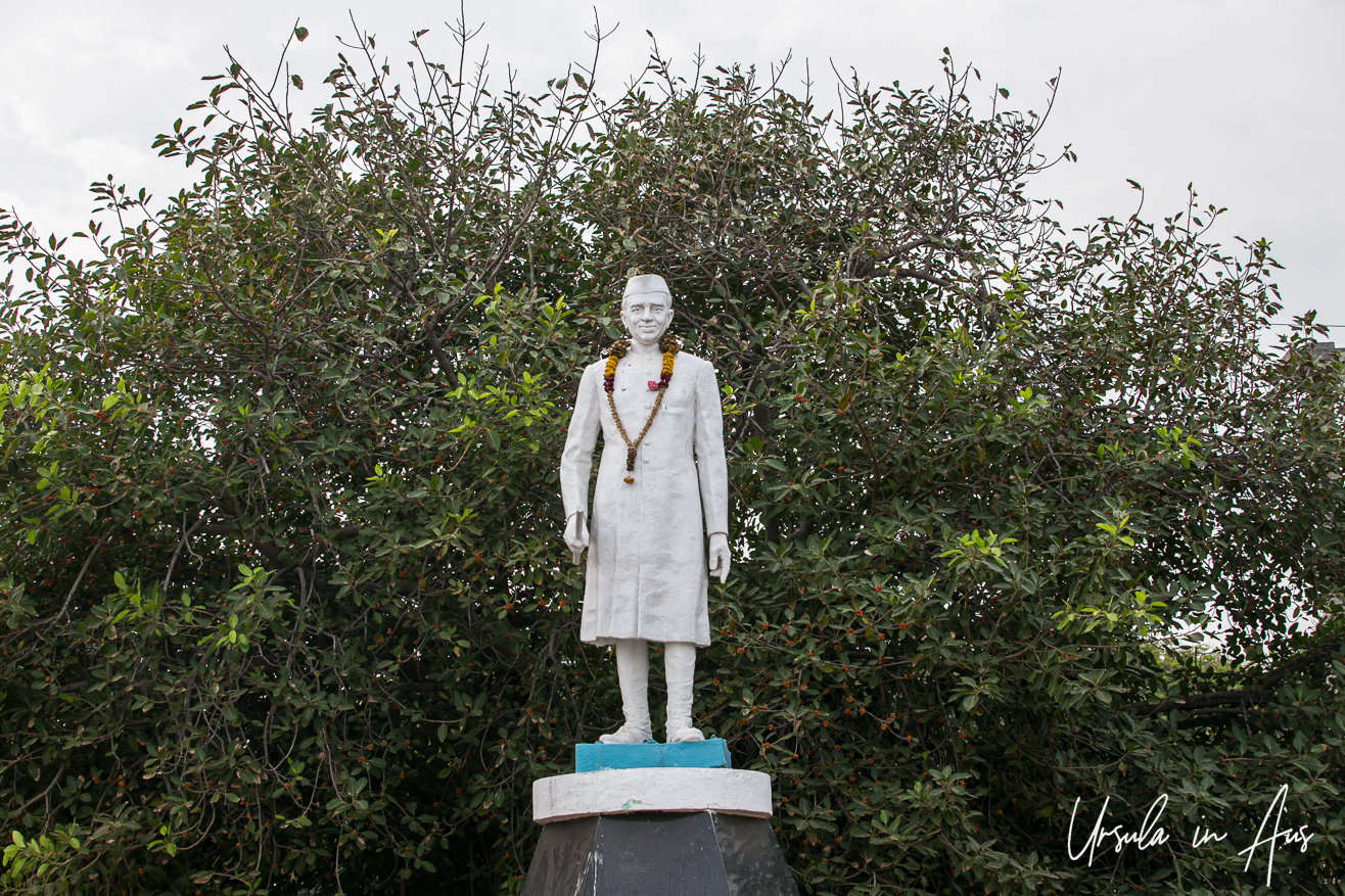A statue to Jawaharlal Nehru, the first Prime Minister of Independent India stands on a pedestal nearby.