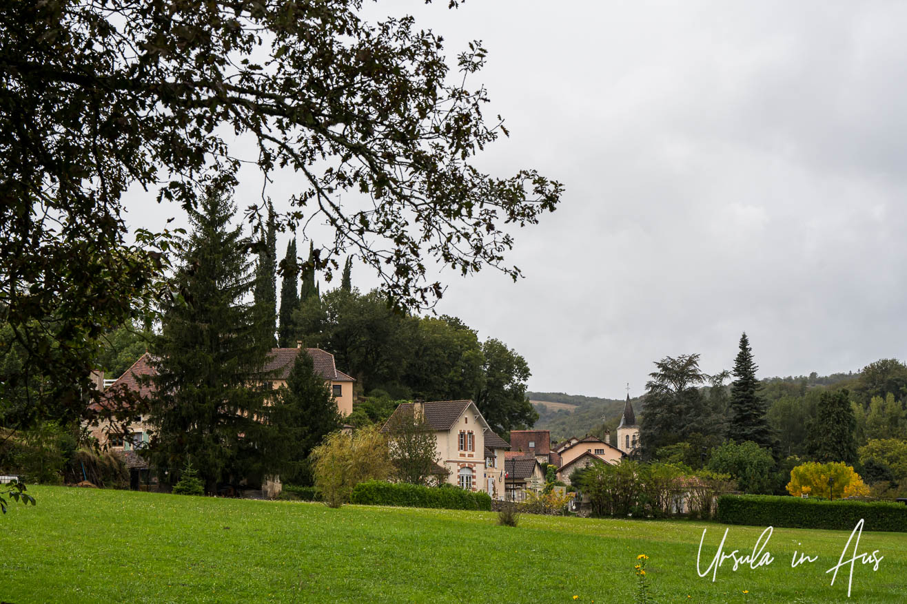 I was visiting friends in Cahors, a mere 30 km (19 mi) to the west. Our plan was to walk 4 km (2.5 mi) along the towpath, the Chemin de Halage, from Bouziès to Saint-Cirq Lapopie (see: the Chemin de Halage). Unfortunately, rain drove us back when we were halfway, so we drove the rest of the distance, and parked above the village.