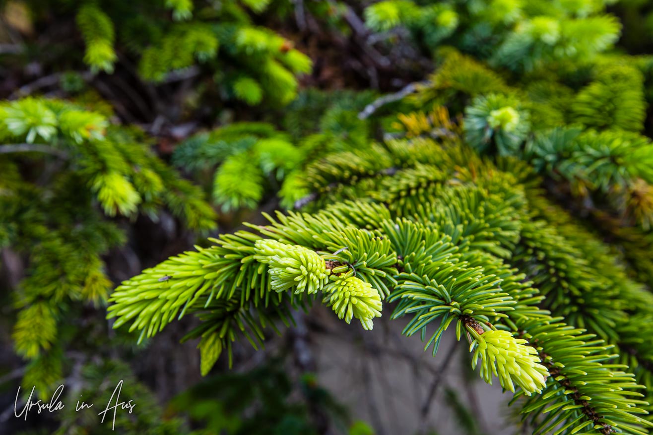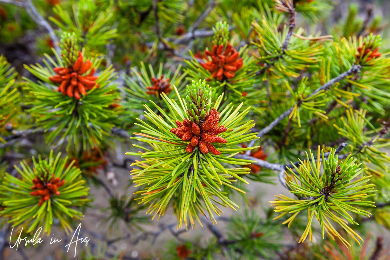 Out of the shadows of the forest it is easier to get a good look at the different conifers that grow here. Male cones (microstrobili) cluster on the new shoots of a lodgepole pine.