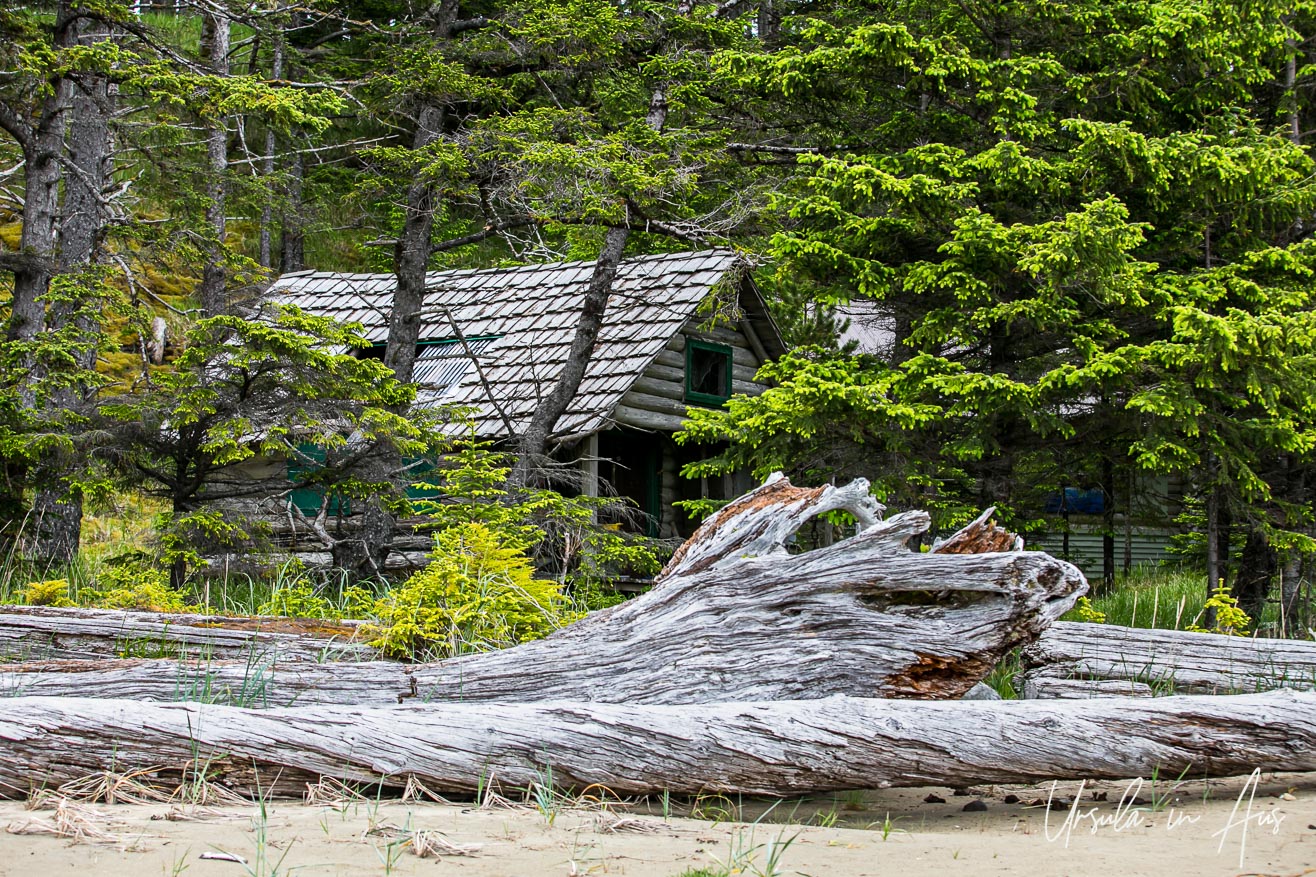 This says the Pacific Northwest to me: cedar shakes on the roof of a cottage, and massive washed up driftwood on the shoreline.