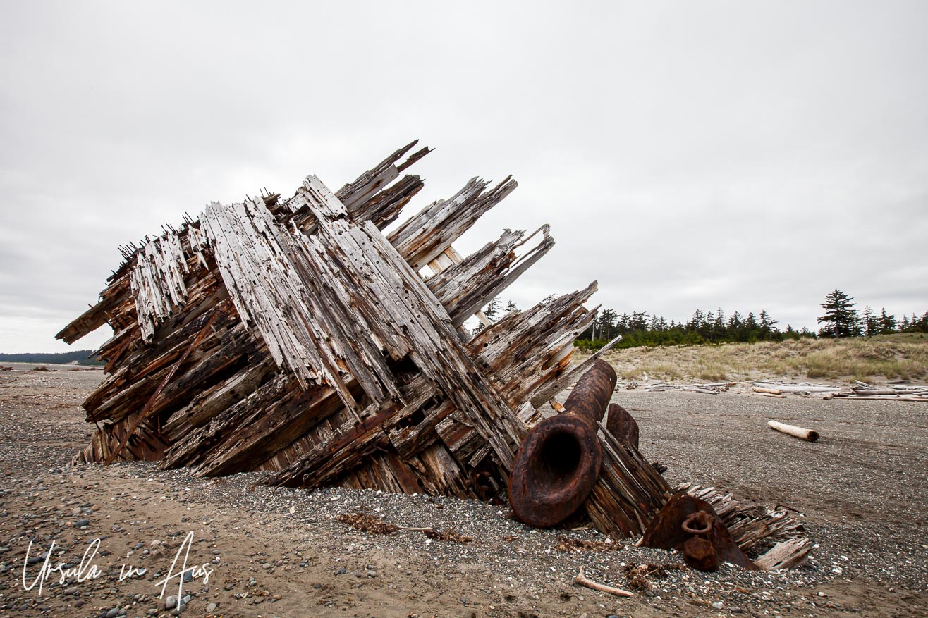 Hull recovery efforts failed, so salvage operations stripped what they could. The remnants of this massive ship were abandoned on the beach – where weathered wood and rusty portholes remain.