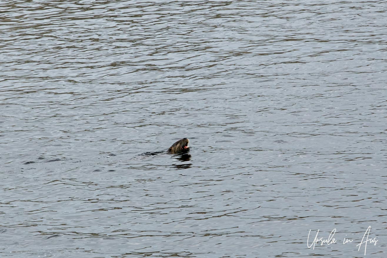 There are two kinds of otters in this region: river otters (Lontra canadensis) and sea otters (Enhydra lutris). While this little fellow is too far away for me to be sure, it is probably the more common river otter.