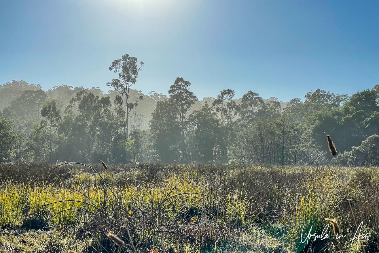 The landscape around the lake is remarkably varied. In the early Sunday morning haze, the tall gums that surround these grasslands fade into the background. (11July2021)