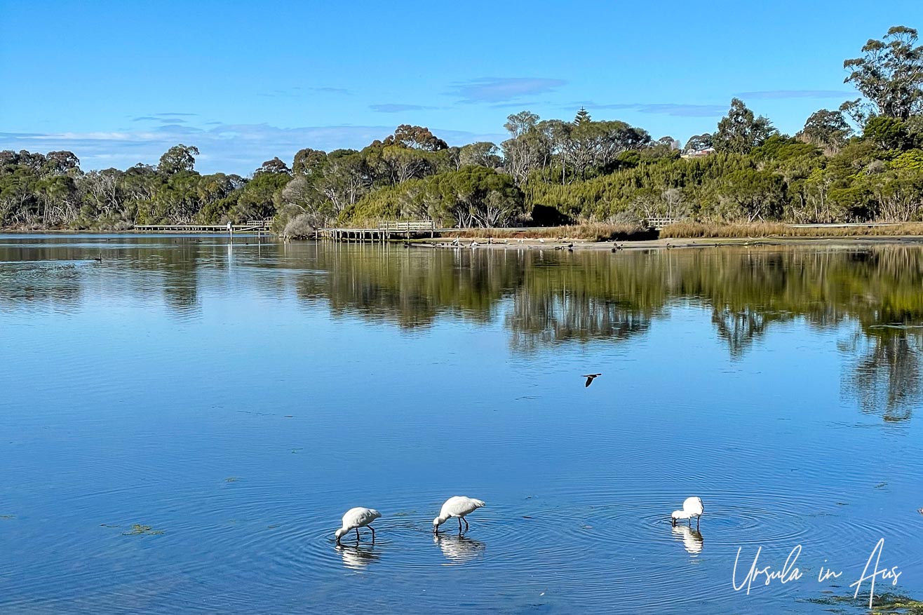 Spoonbills and ibises are regular visitors to the mudflats at low tide, and egrets, herons, black swans and Australian pelicans can usually be found. (17August2021)