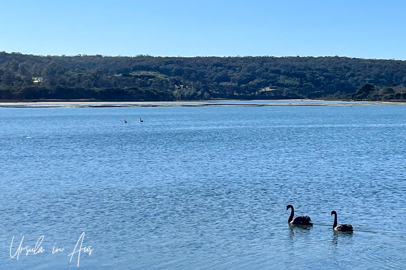 Every day the colours are different. The black swans (Cygnus atratus) look so elegant gliding across the lake, even with pond-grass hanging from their beaks. (24August2021)