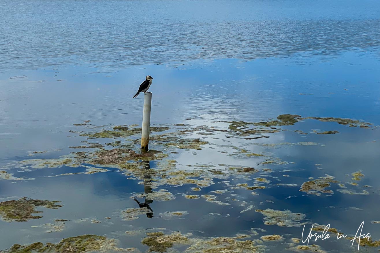 We have three kinds of cormorants on the lake: little pied cormorants (Microcarbo melanoleucos), pied cormorants (Phalacrocorax varius), and great cormorants (Phalacrocorax carbo). I think this is the first. (28August2021)